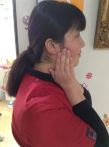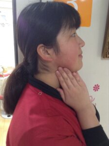 3つ目が舌下腺で、親指を使って顎先の内側を押し上げます。