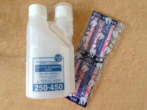 フッ素洗口は専用の容器に粉と水道水を混ぜ合わせ、